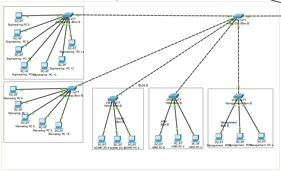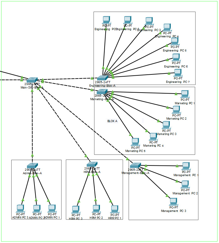 - VLAN voor elke groep van de organisatie: Admin, Hrm, Marketing, Engineering en Management